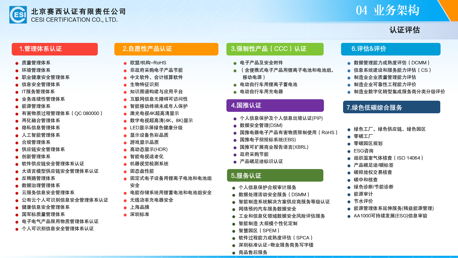 赛西认证2012年成为国家认监委指定的强制性产品认证(CCC)机构;2016年获国家高新技术企业称号、成为工信部首批工业节能与绿色发展评价中心;2017年创建“全国绿色工厂推进联盟”并任秘书处单位 ;2019年被列为首批CS评估机构;2021年成为首批DSMM评价机构;2022年发布《零碳工厂评价通则》;2023年获得CNAS环境信息审定与核查机构认可,认可业务范围为组织温室气体(GHG)声明核查(21类全部);2024年获得首批制造企业可靠性工程能力评价机构证书、入围产品碳足迹标识认证试点机构;2025年获批“数据安全管理认证”与“个人信息保护认证”两项国推认证资质。