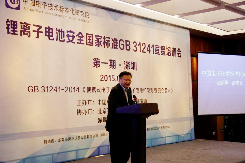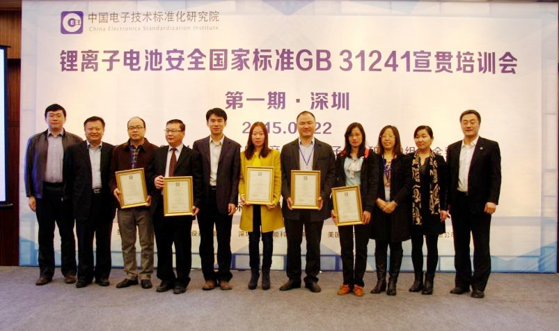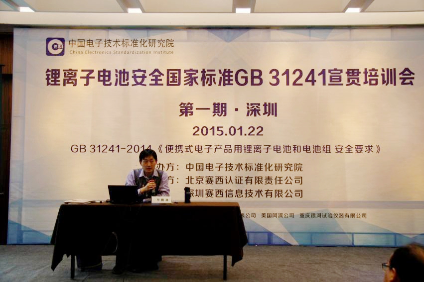 2015年1月22日,由中国电子技术标准化研究院主办,北京赛西认证有限责任公司、深圳赛西信息技术有限公司协办的锂离子电池安全国家标准GB 31241宣贯会暨首批锂电池产品安全认证证书颁发仪式在深圳召开。工业和信息化部、国家标准化管理委员会、中国民航危险品运输管理中心及会议主办方的领导到会出席并致辞,来自锂电池产品生产企业、检测机构的百余名代表参加了本次会议。