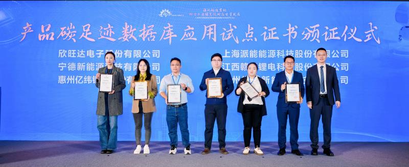 分论坛上,电子标准院认证中心主任、赛西认证总经理段淼代表电子标准院与上海市经济信息中心、上海易碳数字科技有限公司分别就锂电池碳足迹背景数据库签署合作协议,并为惠州亿纬锂能股份有限公司、欣旺达电子股份有限公司、宁德新能源科技有限公司、惠州锂威新能源科技有限公司、上海派能能源科技股份有限公司、江西赣锋锂电科技股份有限公司等企业颁发锂电池碳足迹背景数据库应用试点证书。
